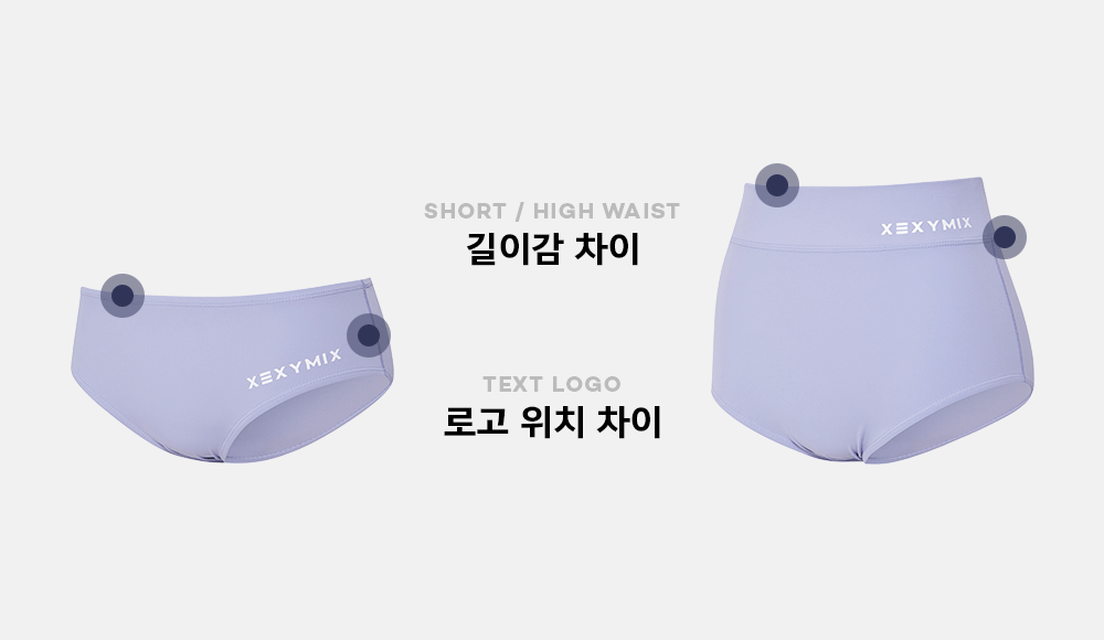 비키니팬티는 허벅지가 시작되는 부분에, 비키니 하이웨이스트 팬티는 허리 밴드에 젝시믹스 텍스트